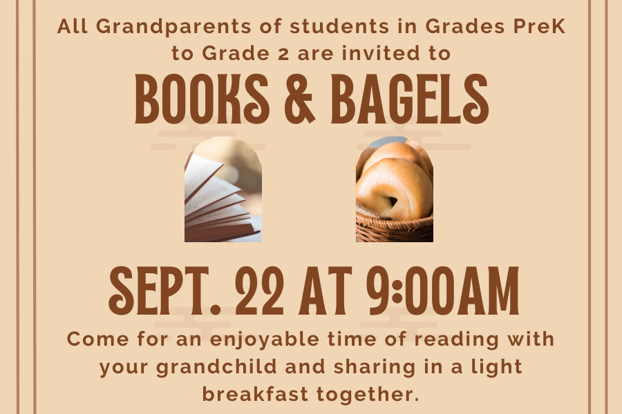 Grandparents of students in Pre-K through Grade 2 are invited to Books & Bagels! Come join us for an enjoyable time of reading with your grandchild and sharing in a light breakfast together.